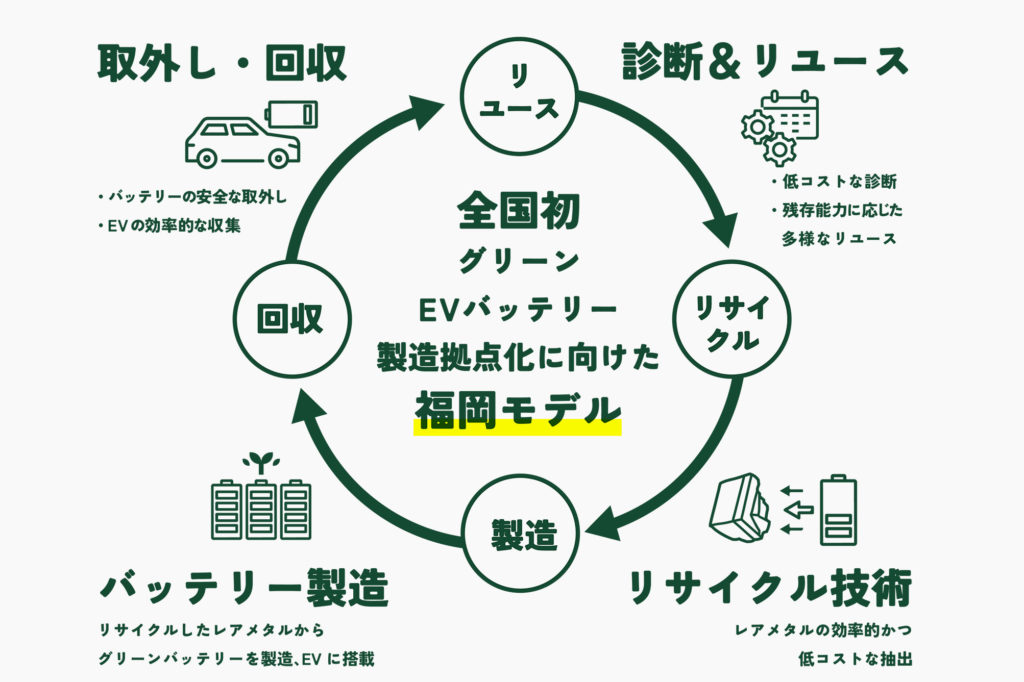 使用済EVバッテリーの資源循環を進めることで、再生可能エネルギーの普及や地域の環境保全に取り組む「福岡モデル」づくりに協力していきます。